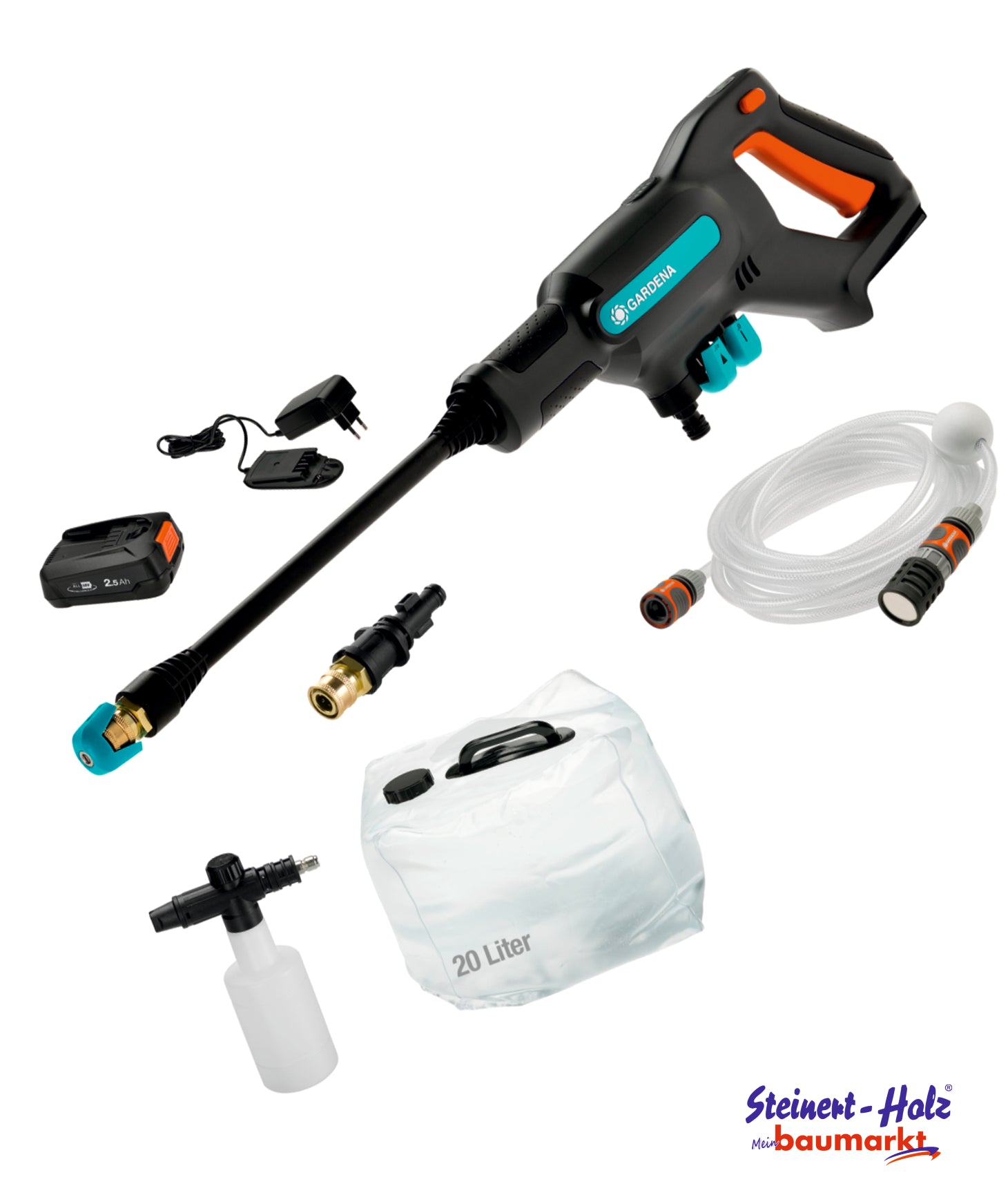 Der GARDENA Akku-Mitteldruckreiniger AquaClean 24/18V P4A ist ideal zur leistungsstarken, mobilen Reinigung rund um Haus und Garten, oder unterwegs. Er ist unabhängig von einer Stromquelle einsatzbereit. Ein fester Wasseranschluss ist auch nicht nötig. Ein Behälter mit Wasser oder eine alternative Wasserquelle, wie etwa ein Regenfass, genügen. Er ist selbstansaugend bis zu zwei Meter Tiefe und verfügt über drei Reinigungsstufen: 9, 14 und 24 bar. Mit 5 m Saugschlauch mit Filter, Schwimmer und Klammer, drei Reinigungsdüsen 0°, 15° und 45°, langer Lanze für Arbeiten in Bodennähe und kurzer Lanze für kurze Reichweiten. Die Energie liefert ein 18 V System Akku der Power for All Alliance, basierend auf der Technologie von Bosch. Dieser passt in eine Vielzahl anderer Gartengeräte von GARDENA, kann aber auch markenübergreifend mit zahlreichen weiteren Produkten aus der Allianz rund um das gesamte Zuhause verwendet werden. Inklusive Ladegerät. Das Set enthält zusätzlich eine Schaumdüse zum Ausbringen von Reinigungszusätzen und einen 20 l faltbaren Wassertank für den mobilen Einsatz.