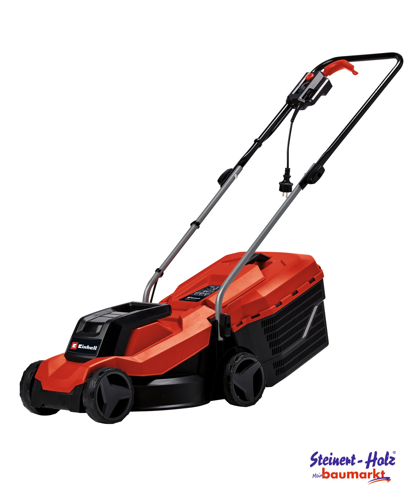 Robuster klappbarer Schubbügel aus pulverbeschichtetem Stahl, Kraftvoller Motor mit einer Leistung von 1.000 W, Klappbarer Führungsholm für eine platzsparende Aufbewahrung, Integrierter Tragegriff für einen einfachen Transport, Empfohlen für Rasenflächen bis 300 m², 3-stufige axiale Schnitthöhenverstellung (30 - 70 mm), 30 Liter Grasfangbehälter,,