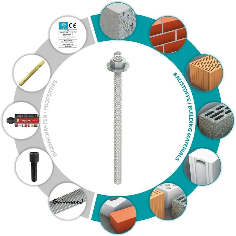 Die TOX Gewindestange Stix-VZ M10 x 130 inklusive Sechskantmutter und Unterlegscheibe eignet sich ideal zur Überbrückung von größeren Distanzen und zur Befestigung von schweren Lasten. Die Gewindestange kann sowohl bei Voll- und Lochstein als auch Ziegelstein und Porenbeton in trockenen Innenräumen verwendet werden. Die Stix Ankerstangen sind in den Zulassungen für Verbundanker Contact und Verbundmörtel Liquix Pro 1 und Liquix Plus 7 erfasst.