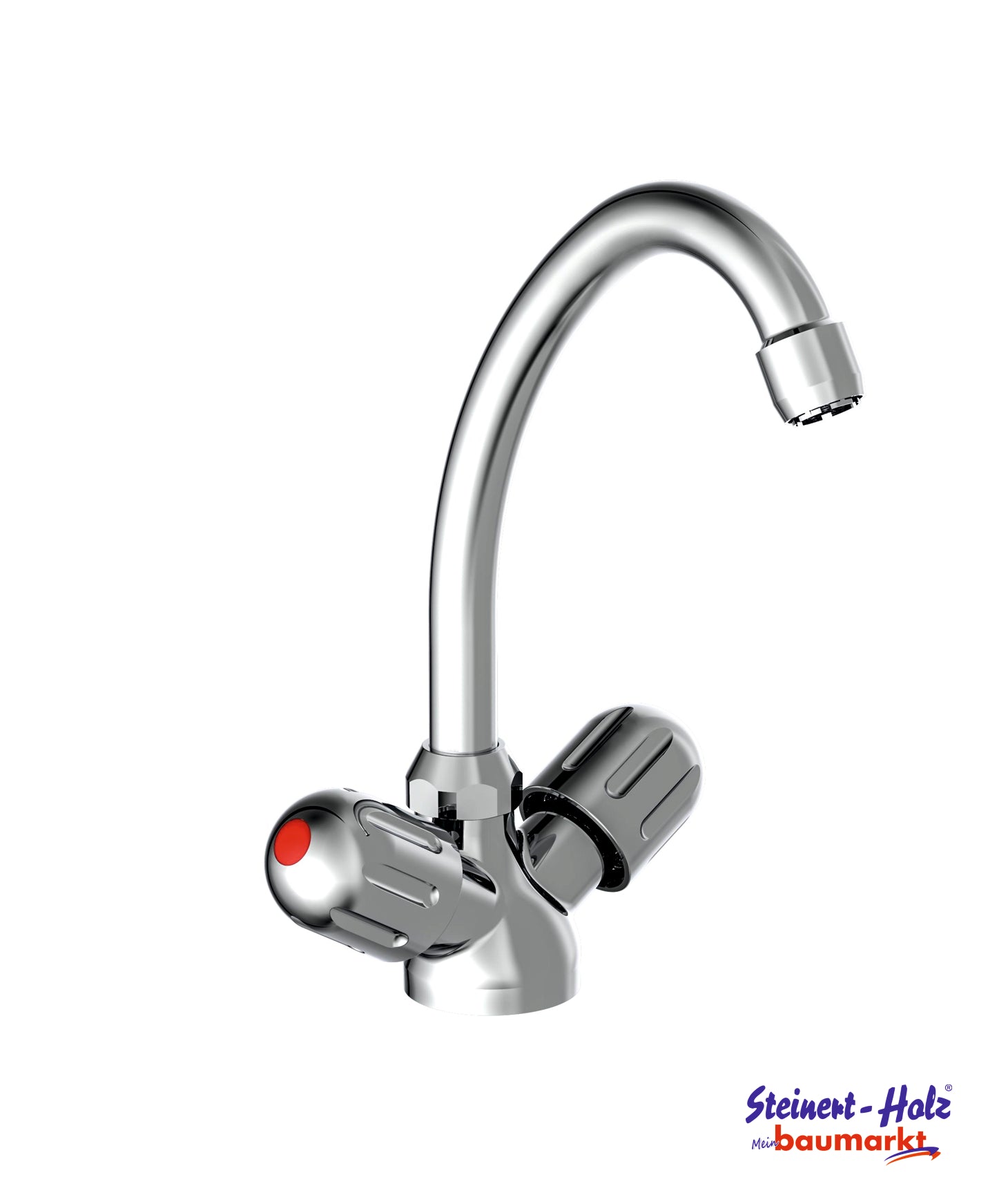 Bei diesem Wasserhahn handelt es sich um eine Niederdruckarmatur, die ausschließlich bei drucklosen Untertischgeräten/Kleinspeichern zum Einsatz kommt. Sie wird mit drei flexiblen Anschlussschläuchen geliefert. Mit dem 360° schwenkbaren Auslauf kann die Küchenarmatur komfortabel zur Seite gedreht werden und erleichtert z.B. das Säubern der Spüle. Dieser Wasserhahn ist ideal für den Einsatz bei Doppelspülbecken. In der Zweigriffarmatur sind langlebige, keramische Ventiloberteile mit genormten ½'' -Maß verbaut. Bei Bedarf können diese ganz einfach ausgetauscht werden. Im Lieferumfang enthalten ist ein vollständiges Montageset und eine mehrsprachige, bebilderte Montageanleitung. Die korrosionsbeständigen Anschlussschläuche (500 mm) an das Hauswassersystem sind flexibel und leicht zu montieren. Der in der Küchenarmatur verbaute Strahlregler vom Markenhersteller steht für Langlebigkeit und ein homogenes Strahlbild.
