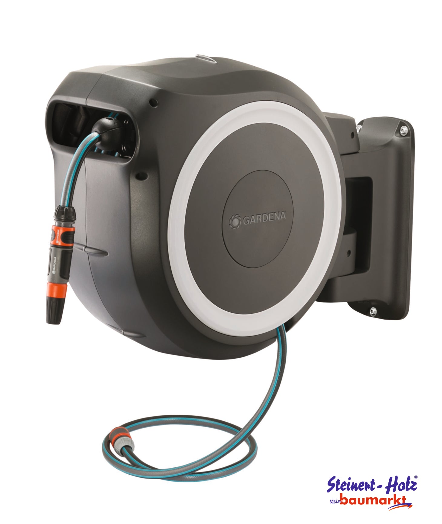 Mit der GARDENA Wand-Schlauchbox RollUp M/L ist der Gartenschlauch sofort einsatzbereit und nach der Bewässerung schnell und ohne zu verknoten verwahrt, geschützt vor Schmutz und Beschädigungen. Mit kurzen Arretierstopps kann der Schlauch auf die gewünschte Länge ausgezogen werden. Dank RollControl genügt ein kurzer Zug am Schlauch und er wird mit gleichmäßiger Geschwindigkeit und sicher automatisch wieder aufgerollt. Die Wandhalterung ist um 180° schwenkbar, mit praktischer Halterung zum Aufbewahren von GARDENA Spritzen oder Brausen. Die Wandschlauchbox ist frostsicher. Mit 25 m Qualitätsschlauch 13 mm (1/2''), Anschlussschlauch, Original GARDENA Systemteilen und Spritze. Inklusive Wandhalterung mit Schrauben, Dübeln und Montagehilfe. Mit Diebstahlsicherung.